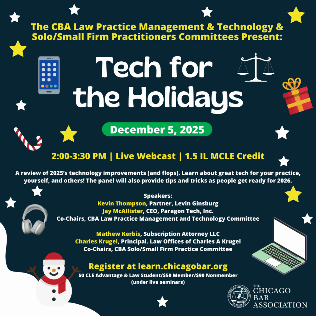 An annual tradition, the Law Practice Management and Technology Committee along with the Solo/Small Firm Practitioners Committee is pleased to present our review of 2025’s technology improvements (and flops). Learn about great tech for your practice, yourself, and others! The panel will also provide tips and tricks as people get ready for 2026.
